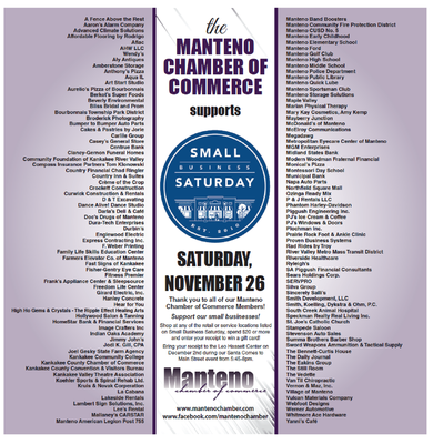 Head out and support the small businesses of Manteno!! If you make a purchase of $20 or more at any of our Chamber member locations listed on the ad, bring your receipt to the Community Center on December 2 during the Santa Comes to Main Street event. You will be entered to win a prize. Support local!